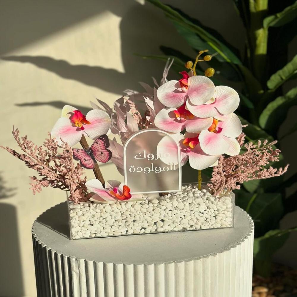 إذا ودك شي راقي ترسله مباركة للي تحبه أو تبي تخله يتأكد أنك متذكره دايم ورد مبروك المولود هذا أفضل شي، لأنه دايم ما يذبل لأنه ورد أكريلك فخم، ويروح للي تود ترسله مع إضافة عبارة مبروك المولودة مع كتابة عبارة على الكرت باللغة العربية أو الإنجليزية مجانا والتصميم راقي يبيض وجهك للي تحبه.